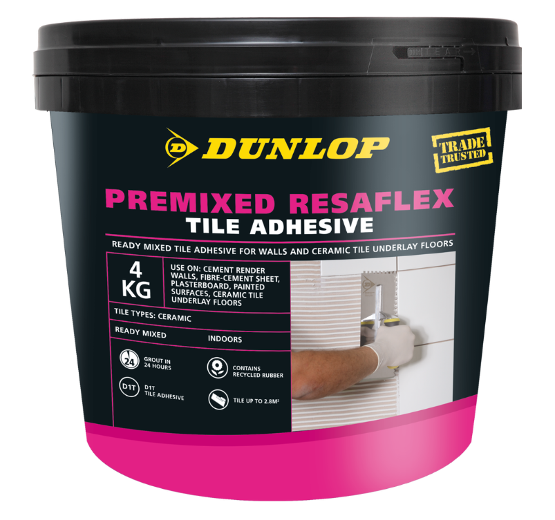 Dunlop Premixed Resaflex is a ready-to-use, flexible tile adhesive ideal for interior wall applications, including cement render, plasterboard, and fibre-cement sheets. It bonds strongly to ceramic tiles. Prior to application, ensure surfaces are clean, dry, and free from contaminants. Apply with a notched trowel and allow 24 hours before grouting. Coverage varies based on tile size and trowel used—typically 0.3m²-0.7m² per kg. Drying time is 24 hours. Clean tools and spills with water before the adhesive dries. Avoid use on floors or waterproofing membranes.