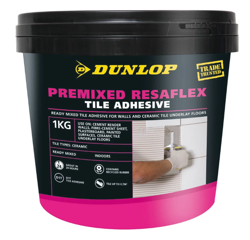 Dunlop Premixed Resaflex is a ready-to-use, flexible tile adhesive ideal for interior wall applications, including cement render, plasterboard, and fibre-cement sheets. It bonds strongly to ceramic tiles. Prior to application, ensure surfaces are clean, dry, and free from contaminants. Apply with a notched trowel and allow 24 hours before grouting. Coverage varies based on tile size and trowel used—typically 0.3m²-0.7m² per kg. Drying time is 24 hours. Clean tools and spills with water before the adhesive dries. Avoid use on floors or waterproofing membranes.