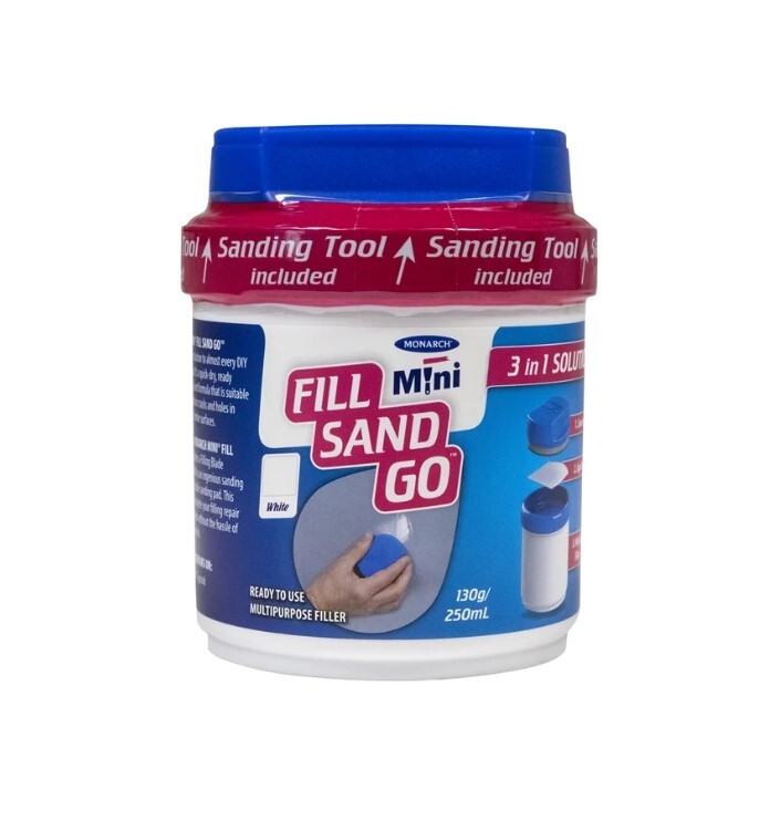 MONARCH MINI® FILL SAND GO™ is an all in one solution to almost every DIY filling repair job. It’s a quick-dry, ready mixed, water-based formula that is suitable for small to medium cracks and holes in plasterboard & timber surfaces.