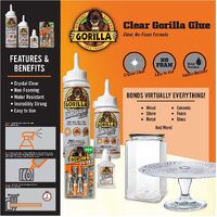 The strength and versatility you have come to expect from Gorilla Glue is now available in an easy to use, crystal clear, non-foaming formula. Clear Gorilla Glue is incredibly strong and is ideal for indoor and outdoor applications and bonds virtually everything.