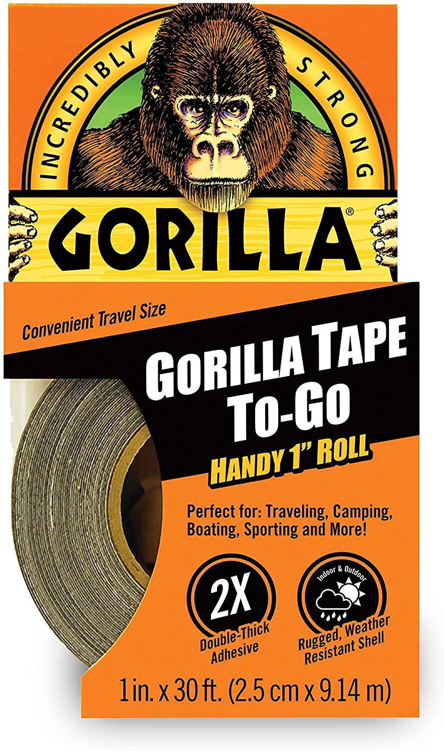 Convenient for on-the-go repairs, Gorilla Tape To-Go's 1 inch width packs a powerful grip in a portable size. With double-thick adhesive, tough reinforced backing and rugged weather-resistant shell, it sticks to rough and uneven surfaces, including wood, stone, stucco and brick, that ordinary tapes can't hold. This size is ideal size for backpacks, toolboxes, glove compartments for camping, boating and more.