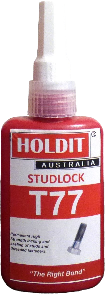 Description: HOLDIT AUSTRALIA T77 Studlock large diameter high strength threadlocker is a red, general purpose adhesive for permanent threaded assemblies. It effectively locks fasteners 1” and larger in diameter, providing a seal against leakage and corrosion while resisting attacks from lubricants and industrial liquids and gases.