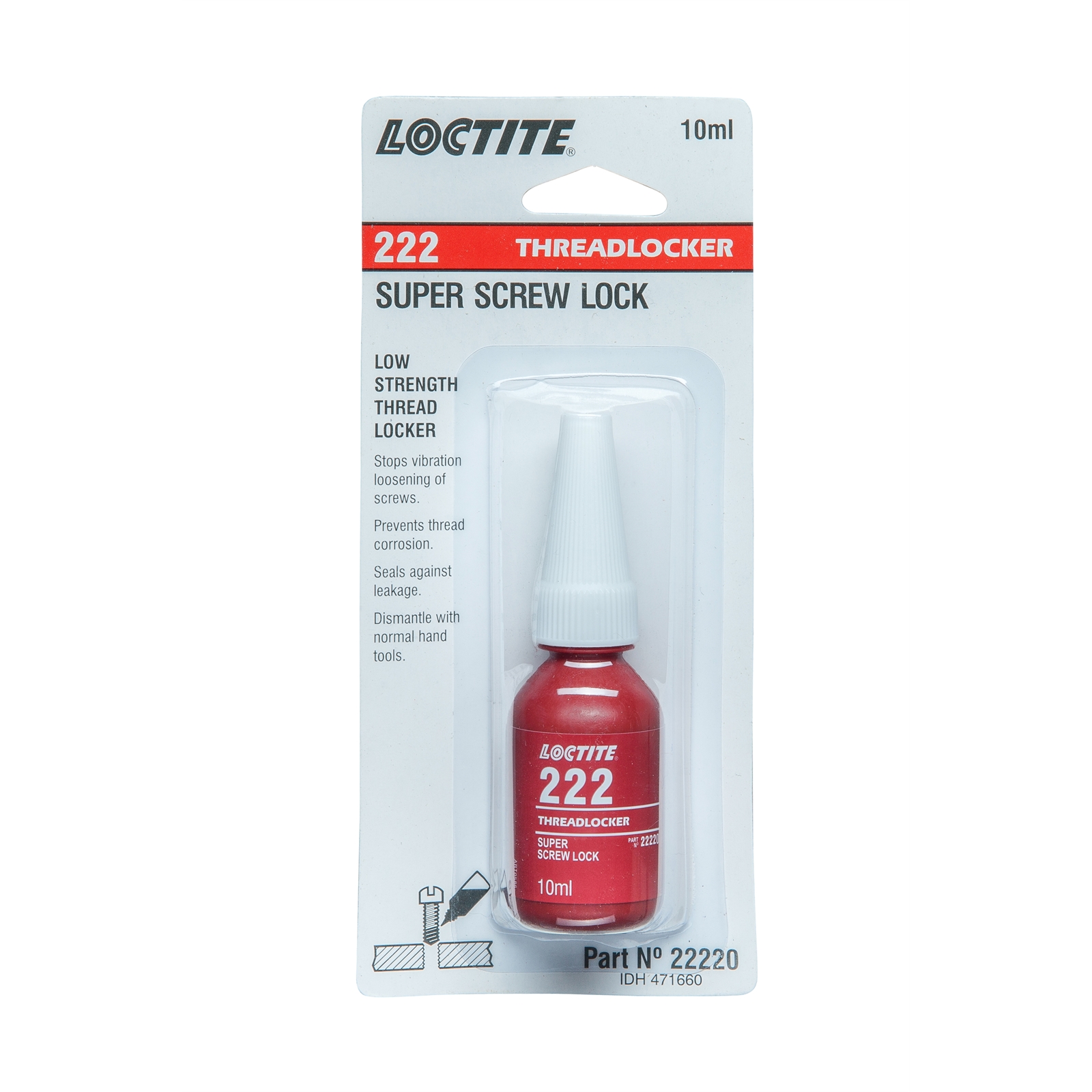Loctite 222 Threadlocker prevents corrosion, loosening from shock or vibration, and seals to prevent leakage. It also allows for simple, hand tool disassembly without shearing the screw. Easy to remove, it is typically used with small screws up to 1/4 inch.