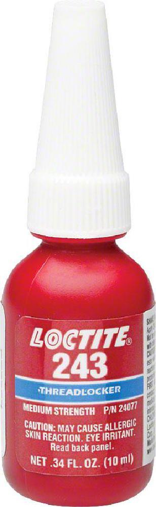 LOCTITE® 243™ is designed for the locking and sealing of threaded fasteners which require normal disassembly with standard hand toolsThe product cures when confined in the absence of air between close fitting metal surfaces and prevents loosening and leakage from shock and vibration. The thixotropic nature of LOCTITE® 243™ reduces the migration of liquid product after application to the substrateLOCTITE® 243™ provides robust curing performance. It not only works on active metals (e.g. brass, copper) but also on passive substrates such as stainless steel and plated surfaces. The product offers high-temperature performance and oil tolerance. It tolerates minor surface contaminations from various oils, such as cutting, lubrication, anti-corrosion and protection fluids