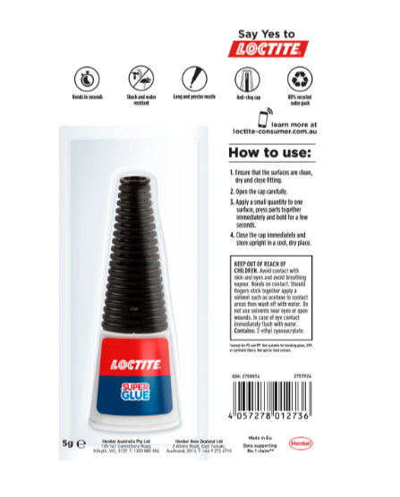 Loctite Super Glue Longneck Bottle features a precision tip which allows controlled application without dripping, thus less mess. It has an easy-open cap with a metal pin that cleans and seals the nozzle for a clog-free performance. The long nozzle is ideal for gluing hard to reach surfaces. The ''finger friendly'' bottle keeps fingers glue free, as well as allows for a continuous flow or a precise drop of glue. It bonds a variety of materials including leather, ceramic, rubber, paper, metal, china, wood and most plastics. Loctite Super Glue Longneck Bottle dries clear and sets without clamping. Loctite Super Glue Longneck Bottle is resistant to moisture, most chemicals and freezing temperatures.