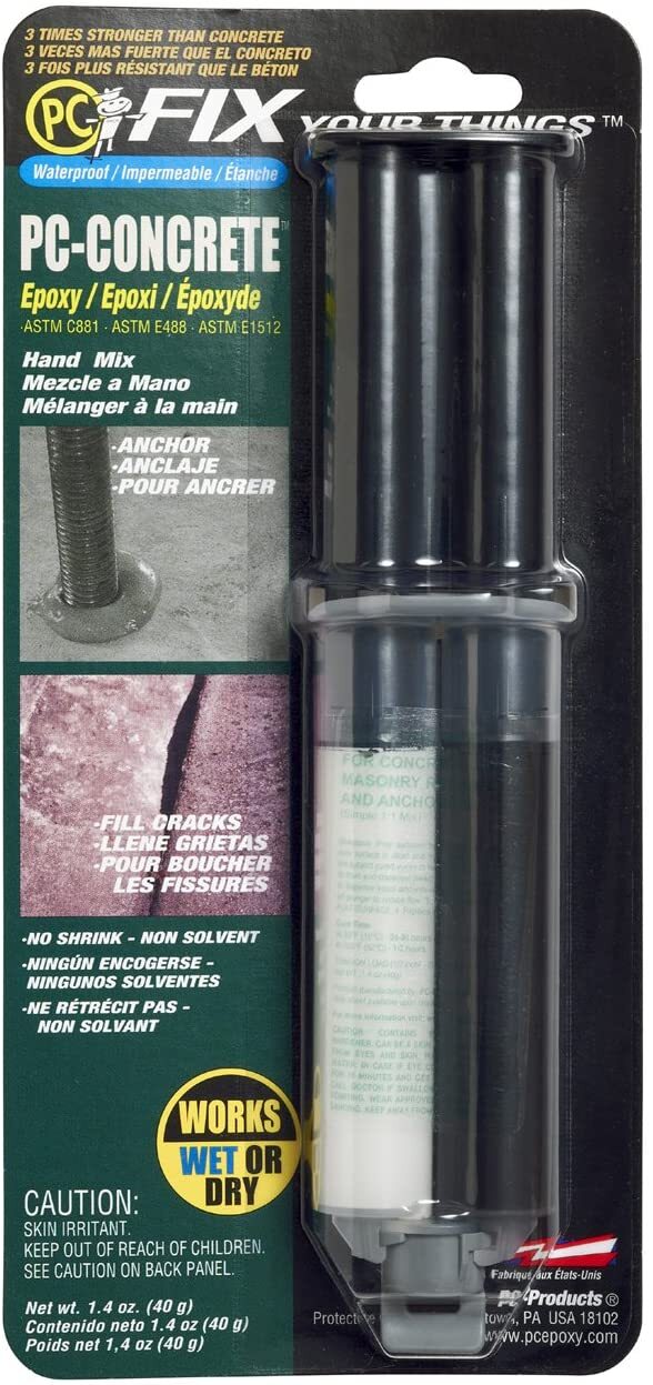 PC-Concrete ™ Anchoring and Crack Filling Epoxy— is the epoxy chosen to repair cracks in a warehouse and factory floors. Dispense and apply using a standard size caulking gun. Cures hard enough to drive over within 3 hours at standard temperature. Nothing stronger for your anchoring applications. PC-Concrete™ is a two-component (1:1 ratio), 100% solids, high modulus, and structural epoxy paste. PC-Concrete™ is a solvent-free, no odour, high strength, moisture insensitive epoxy system. The resin and hardener are uniformly dispensed from a 9-ounce cartridge system and mixed through a mixing nozzle using a standard size caulking gun. (We recommend at least an 18:1 thrust ratio). PC-Concrete™ is also provided in a 22-ounce dual cartridge system for Contractors and Professionals. This size requires a 600ml high thrust dual cartridge dispensing gun. For filling larger cracks and cavities use the 102-ounce bulk kit. PC- Concrete™ will NOT SHRINK. Suitable for Interior and Exterior applications. Can be applied to WET & UNDERWATER surfaces.