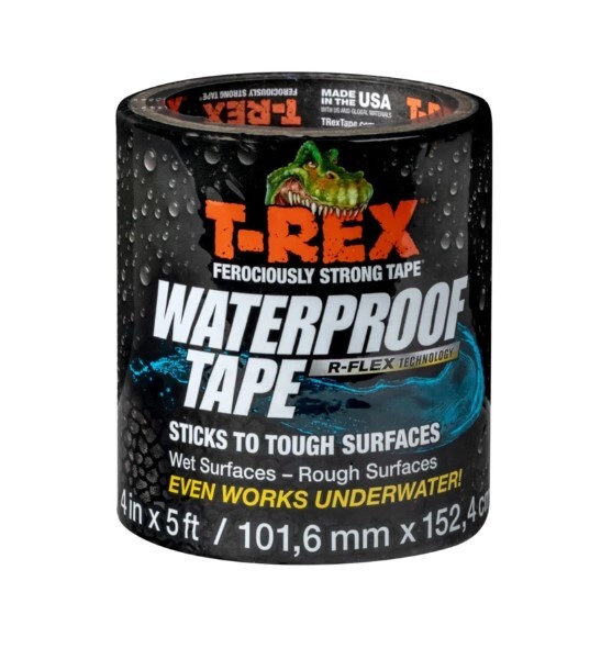 T-Rex® Ferociously Strong Waterproof Tape provides tough waterproof adhesion under wet and dry conditions. Built with R-Flex Technology™, T-Rex Waterproof Tape can stretch up to 700% of its original length. It’s strong enough to be used for general purpose indoor or outdoor fixes that require a waterproof seal, like repairing a rip in an above-ground pool or temporarily stopping a leak in a water pipe. Or, apply it underwater and push it into cracks and rough, dirty surfaces. Formulated to withstand extreme temperatures from -56C to 93C., its UV-resistant formulation won’t break down under harsh sunlight. T-Rex Waterproof Tape. Flexible, ferociously strong, and waterproof like no other.