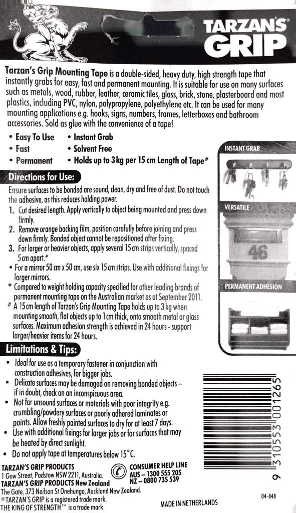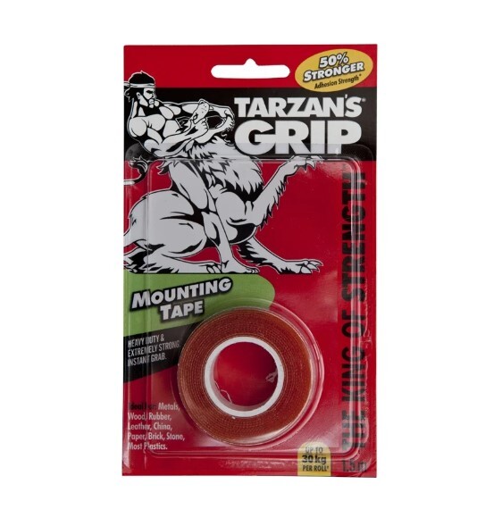 Tarzan's Grip Mounting Tape is a double sided, heavy duty, high strength tape that instantly grabs for easy, fast and permanent mounting.